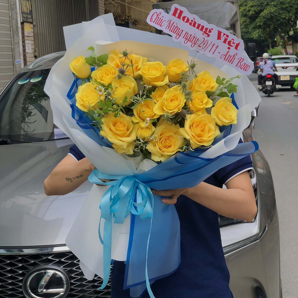 Hoa hồng vàng tượng trưng cho lòng biết ơn, sự kính trọng và tình cảm chân thành dành tặng thầy cô. Sắc vàng ấm áp nổi bật trên nền giấy gói trắng – xanh dương tạo cảm giác thanh lịch, trí tuệ và tin cậy – rất phù hợp với không khí trang trọng nhưng gần gũi của ngày 20/11. Các loại hoa lá phụ được lựa chọn kỹ lưỡng giúp bó hoa thêm mềm mại, cân đối và tươi lâu hơn.