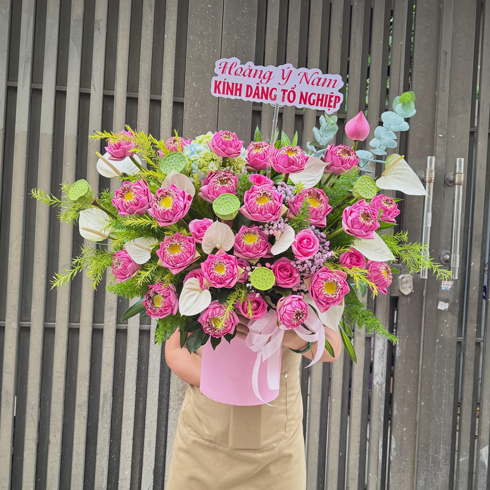 Vào dịp thiêng liêng này, một Giỏ hoa sen hồng với hoa sen làm chủ đạo, kết hợp hồng môn trắng và hoa hồng chính là lựa chọn hoàn hảo để kính dâng tổ nghiệp hoặc gửi tặng thầy cô, đồng nghiệp trong nghề.